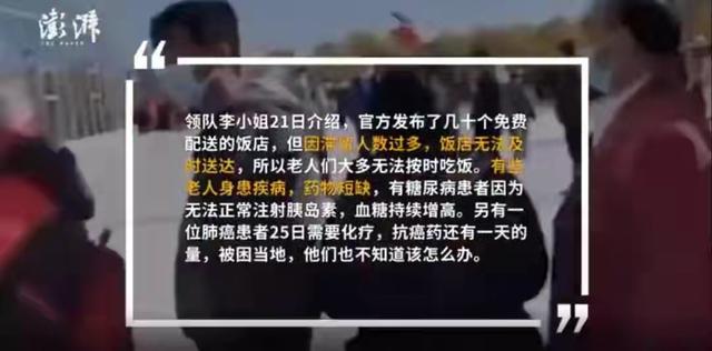 报道引述旅行团领队李小姐表示,因滞留人数过多,饭菜无法及时供应,老人们大多无法按时吃饭。