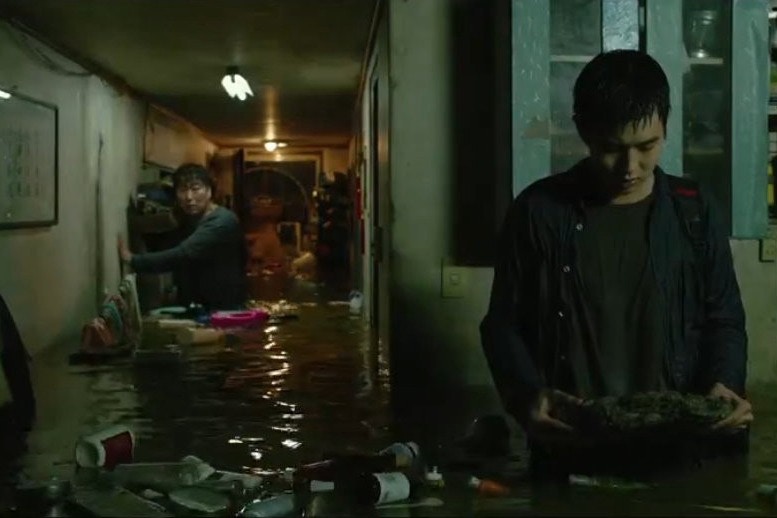 《上流寄生族》电影末段,讲述一场暴雨淹浸主角一家的半地下室,众人赶回家中收拾家当。