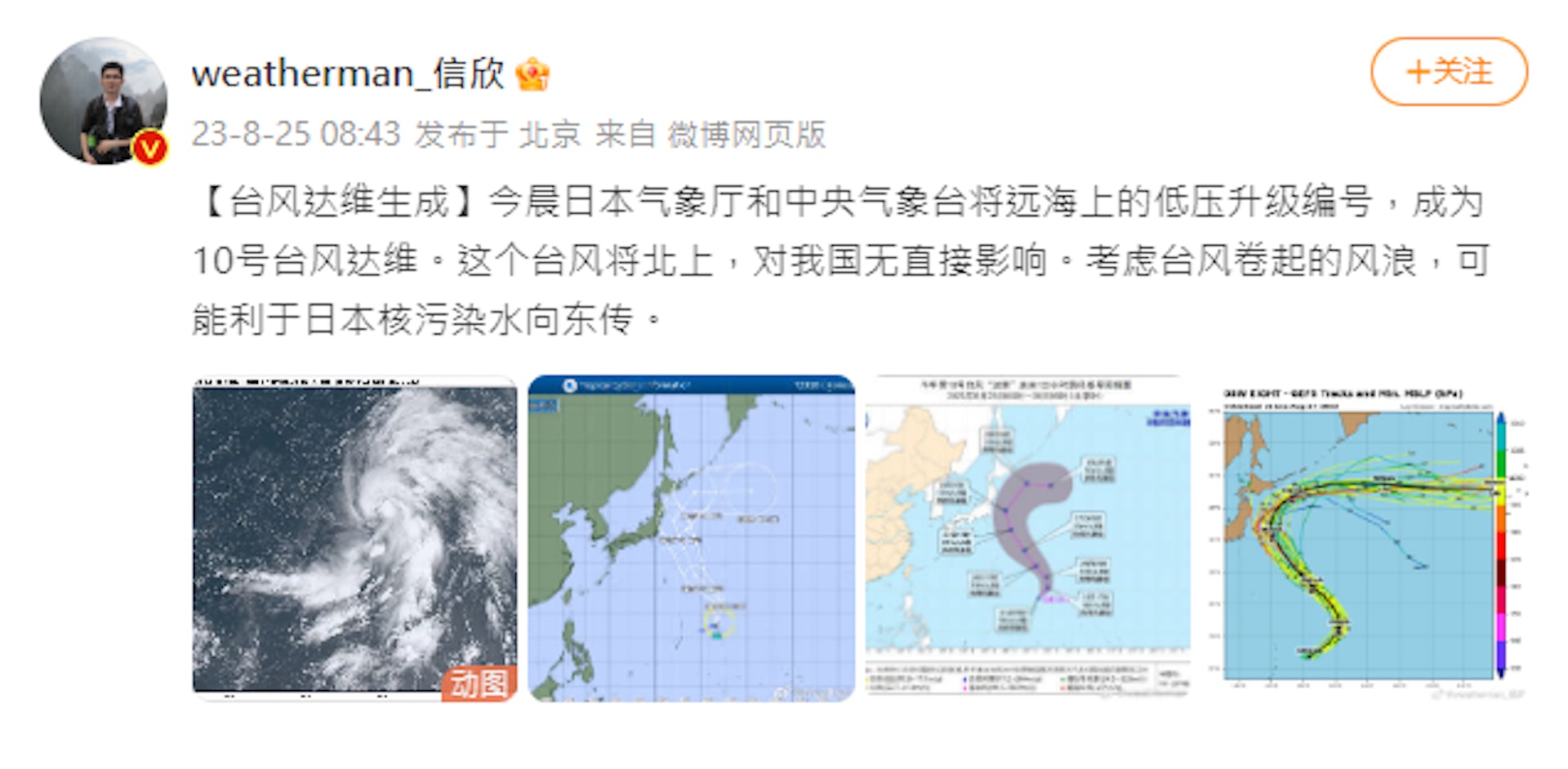 中国气象分析师信欣2023年8月25日在微博的帖子。
