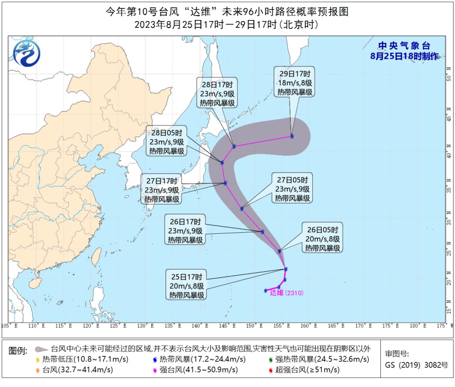 日本气象厅2023年8月25日估计风暴达维的路径。