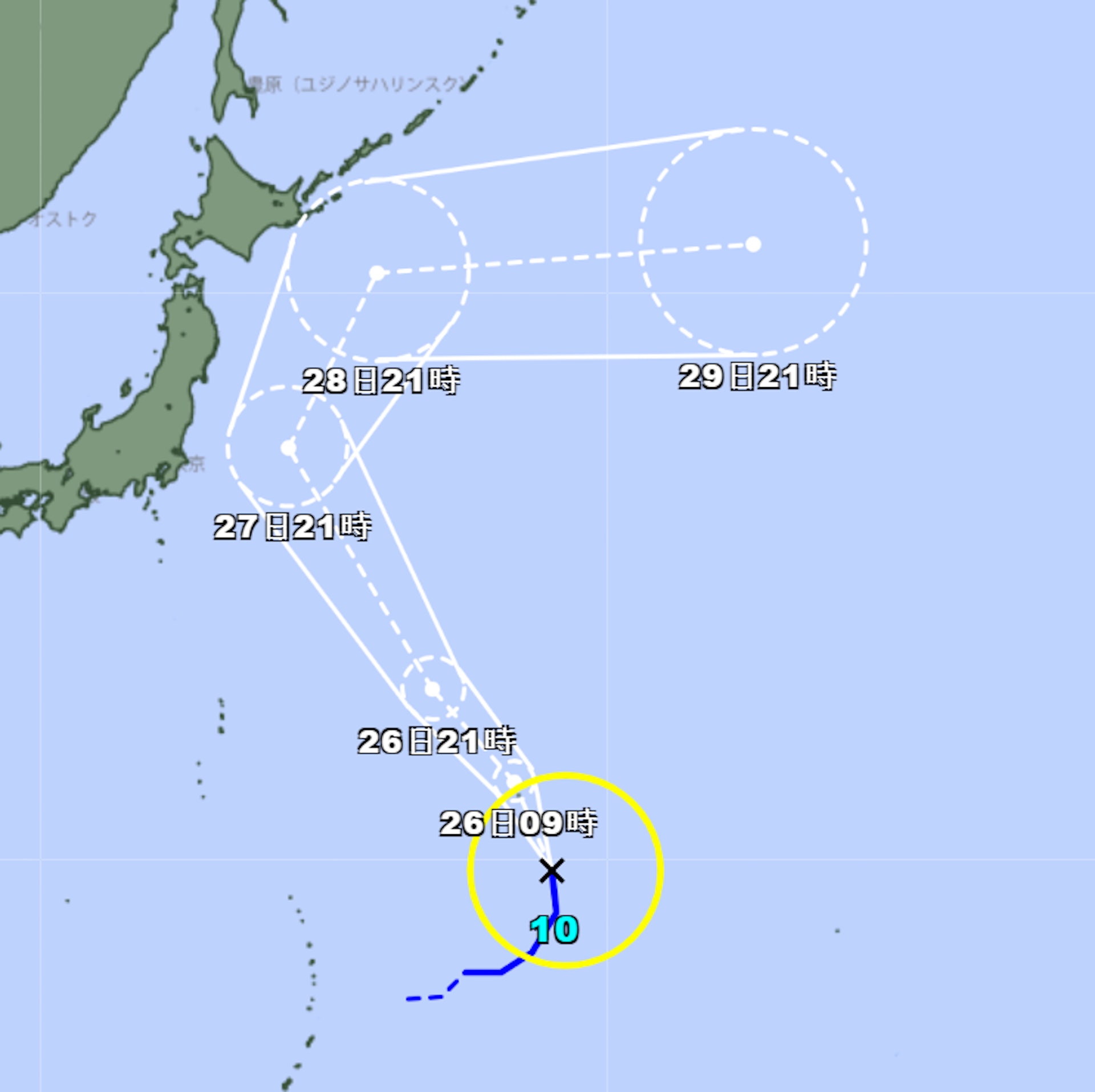 根据中国中央气象台发布的图像显示,在28日至29日间,达维将吹向日本东北地区及北海道以东海域,随后转为向东移动。