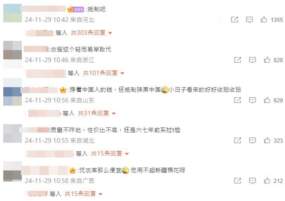 “请退出中国,谢谢”、“衣服这个轻而易举取代”、“他不用我也不买,礼尚往来嘛”、“优衣库那么便宜,他用不起新疆棉花呀”、“不用就不用呗,我们新疆棉还供不应求呢”、“赚中国人的钱,砸中国人的锅,伤中国人的感情”、“耐克(Nike)阿迪(Adidas)不用新疆棉,抵制耐克阿迪,也没见国家队少穿啊”、“天天说抵制,线下抢得比谁都多”