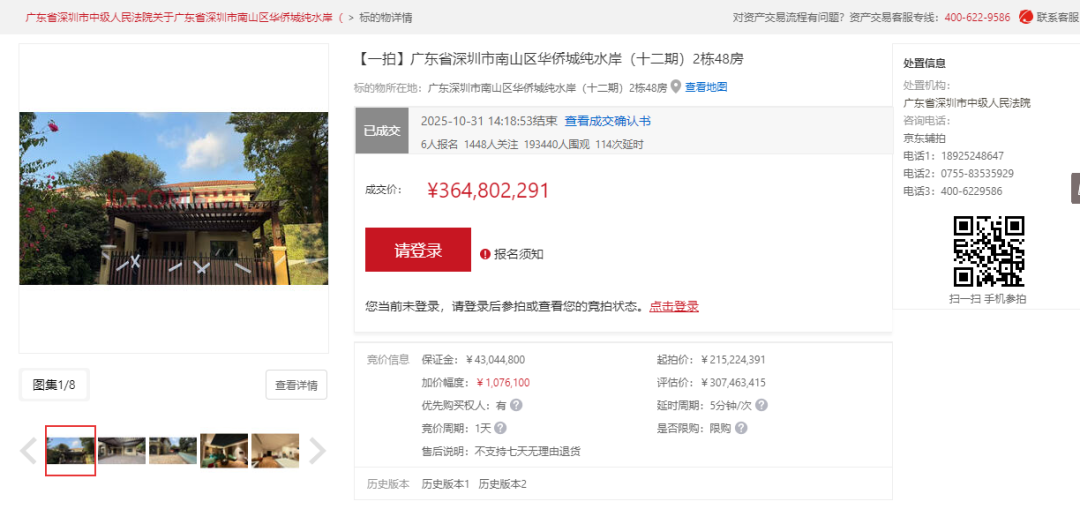 这一价格不仅刷新深圳法拍房成交单价的历史纪录,更一举超越北京、上海同类房源,成为全国法拍市场中总价最高的住宅之一。