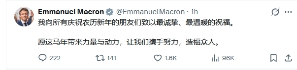 中文 马克龙 社媒X 马克龙社媒X 用中文向大家拜年 责任编辑: 国际小编 (巴黎17日综合电)法国总统马克龙周二(17日)在社交媒体X上用中文发文,向大家拜个年。 发文说:“我向所有庆祝农历新年的朋友们致以最诚挚、最温暖的祝福。愿这马年带来力量与动力,让我们携手努力,造福众人。” 马克龙 文:凤凰新闻图:社媒X、法新社 档案照 高兴 惊讶 愤怒 悲伤 支持