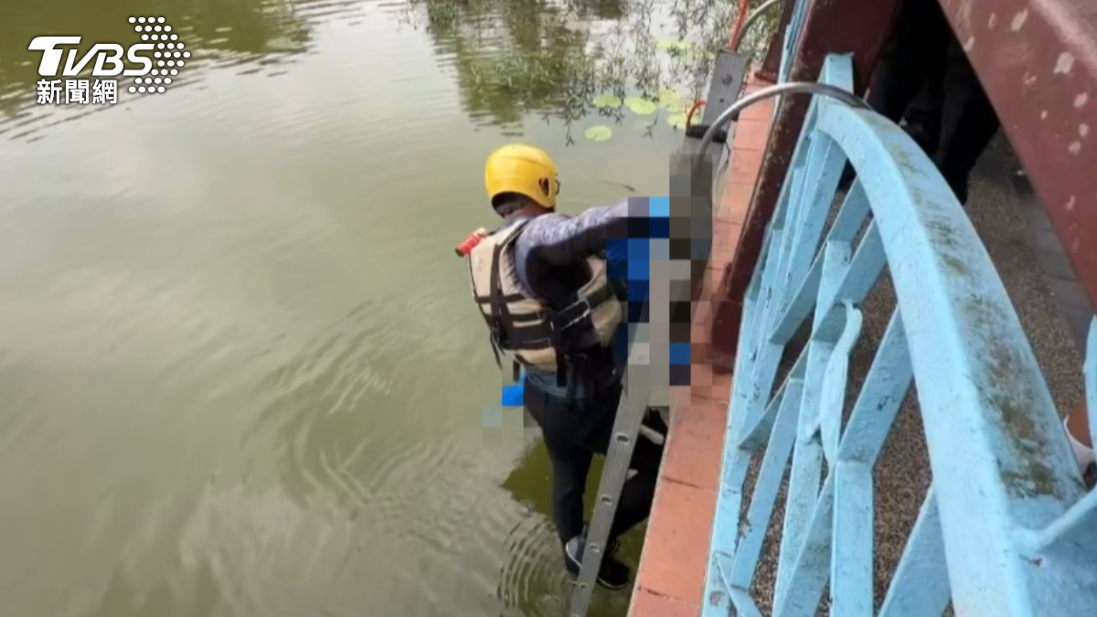 消防人员利用挂梯将大体装入袋中,并由上方同仁利用绳索拖拉后,将大体拖离水面至凉亭,后续转由警方处理。